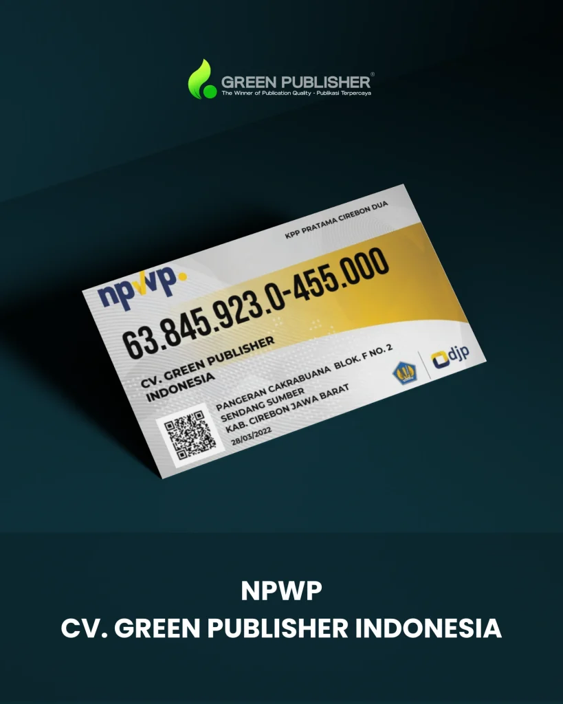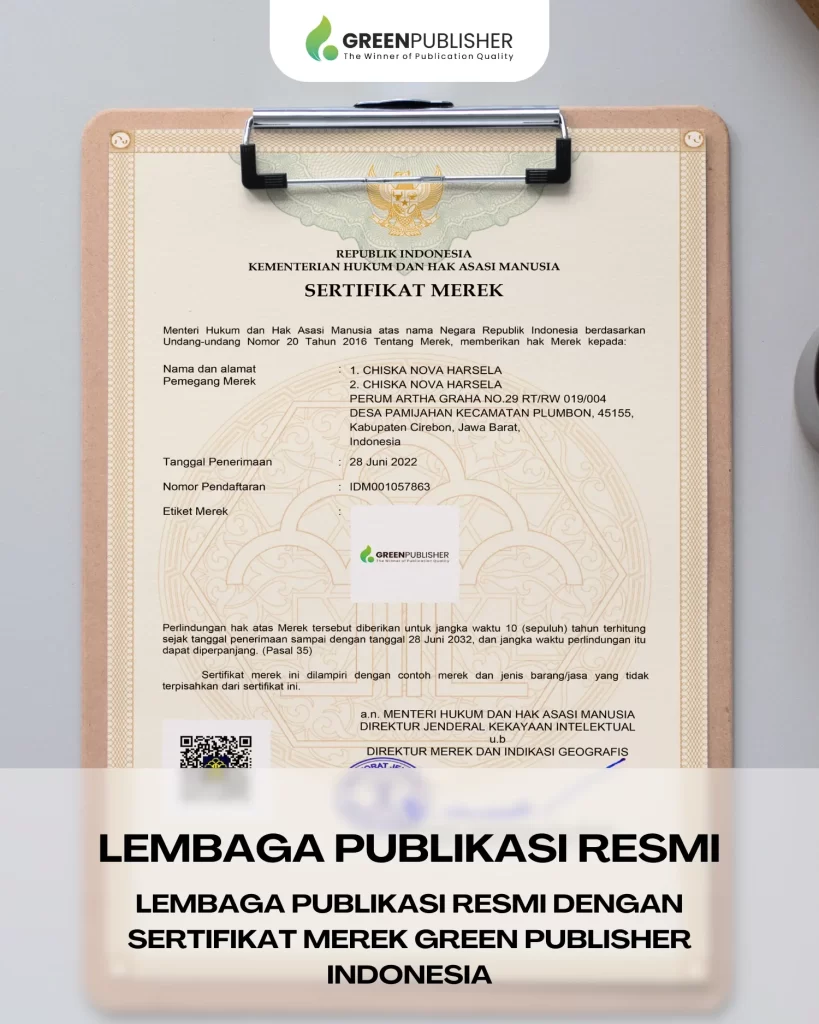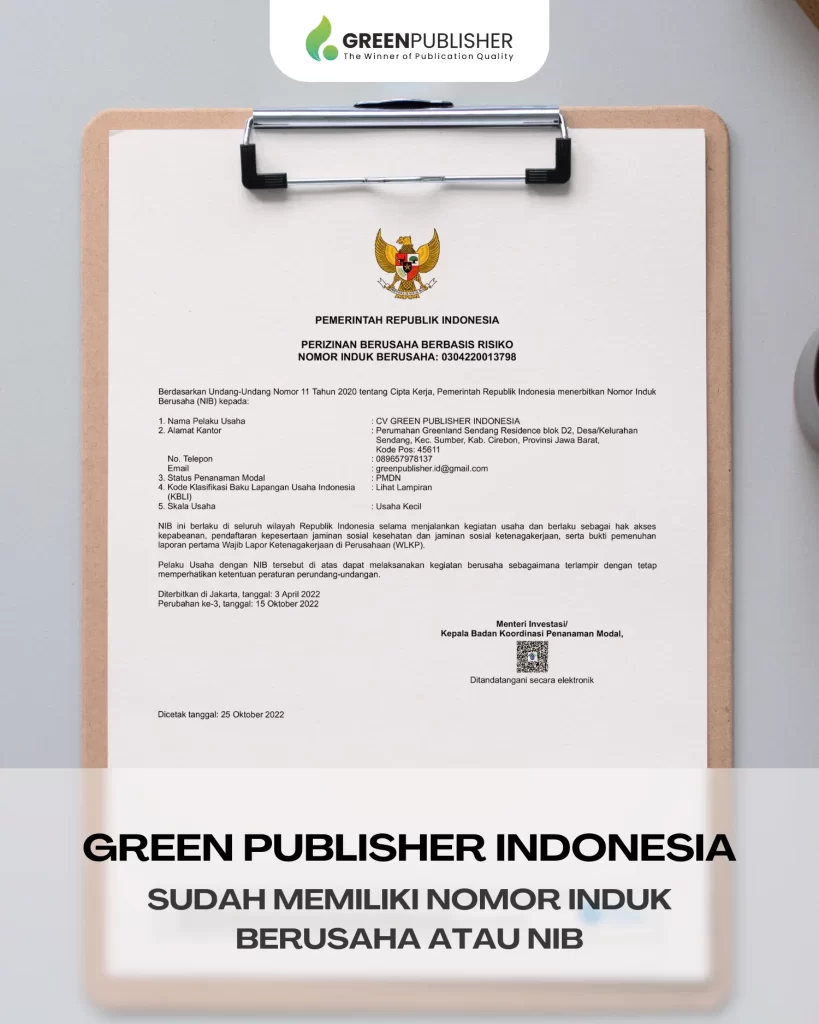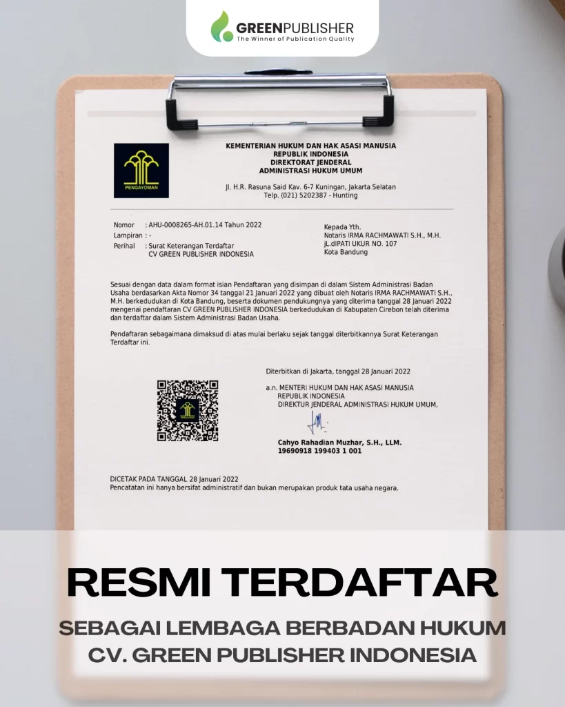 GREEN PUBLISHER adalah Lembaga Publikasi Ilmiah yang sudah berdiri sejak 2018 dan resmi berbadan hukum dengan Nomor Induk Berusaha (NIB): 0304220013798 dan Resmi berbadan hukum serta sudah berbentuk CV. Sejak didirikan, GREEN PUBLISHER telah membantu ribuan akademisi dalam menerbitkan jurnal dan buku, baik yang terakreditasi nasional maupun bereputasi internasional.